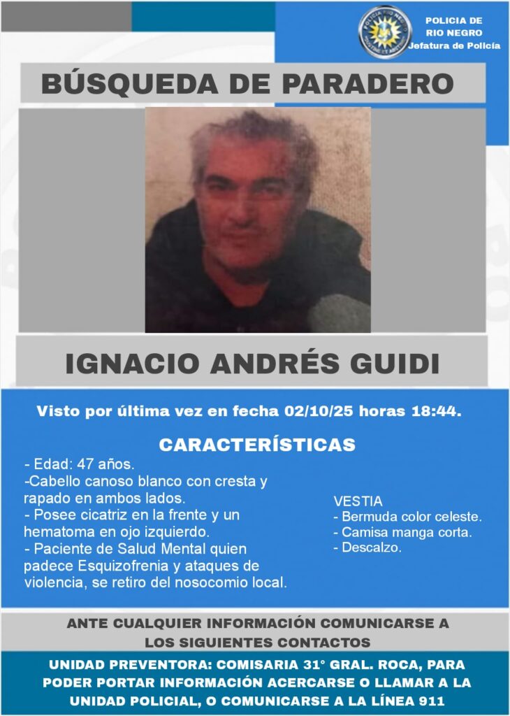 La Justicia de General Roca emitió un pedido de paradero para dar con Ignacio Andrés Guidi, un hombre de 47 años que el jueves por la tarde se retiró del hospital local, donde es paciente, y no regresó para un procedimiento programado.