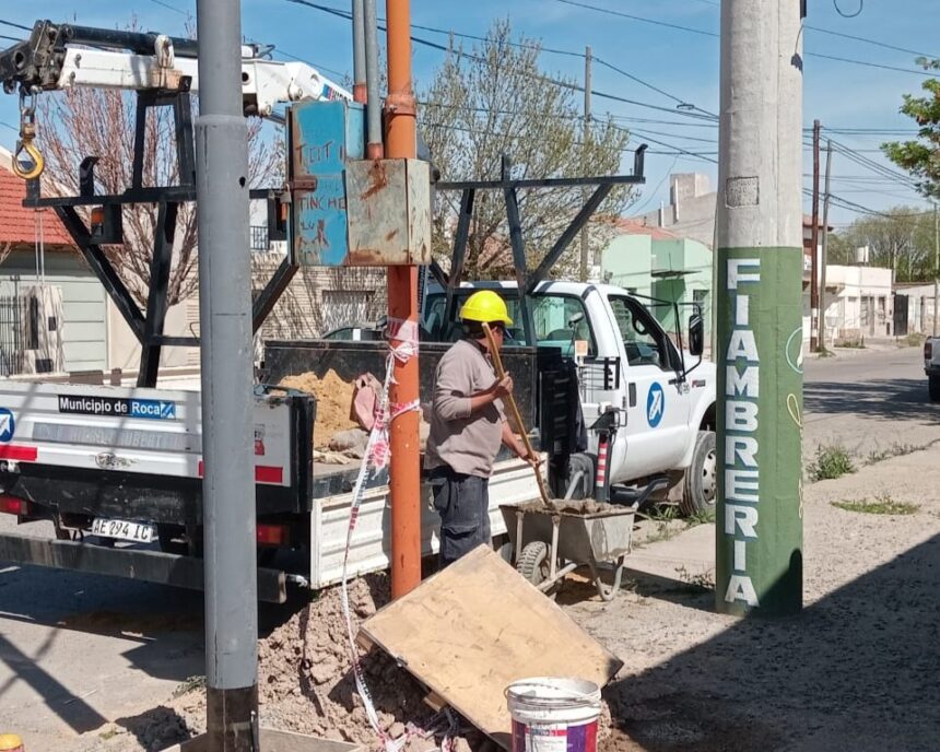 El Municipio de General Roca avanza con la instalación de un nuevo semáforo en la intersección de calle Belgrano y Chulavista, uno de los puntos de mayor circulación vehicular y peatonal de la ciudad.