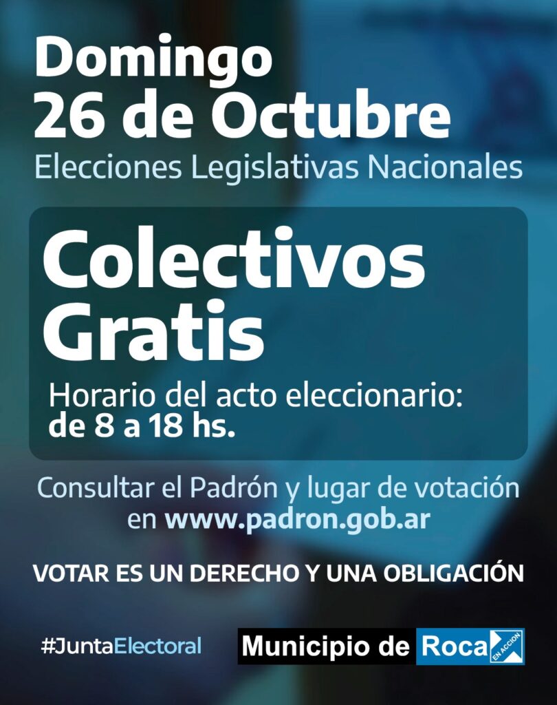 Con motivo de las Elecciones Legislativas Nacionales a realizarse el domingo 26 del corriente, El Municipio de Roca dispuso que el servicio urbano de pasajeros desde y hacia todos los barrios de General Roca sea gratuito para facilitar el traslado de los vecinos que emitirán su voto.